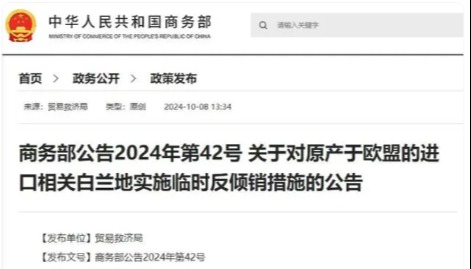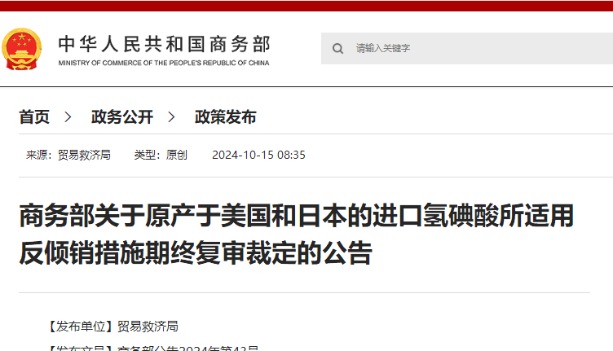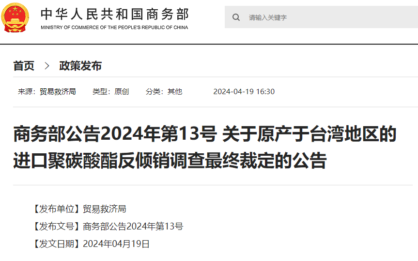 中國商務部網站截圖 全文如下: 根據《中華人民共和國反傾銷條例》(以下簡稱《反傾銷條例》)的規定,2022年11月30日,商務部(以下稱調查機關)發佈2022年第35號公告,決定對原產於台灣地區的進口聚碳酸酯(以下稱被調查產品)進行反傾銷立案調查。 調查機關對被調查產品是否存在傾銷和傾銷幅度、被調查產品是否對大陸聚碳酸酯產業造成損害及損害程度以及傾銷與損害之間的因果關係進行了調查。根據調查結果和《反傾銷條例》第二十四條的規定,2023年8月14日,調查機關發佈初裁公告,初步認定被調查產品存在傾銷,大陸聚碳酸酯產業受到實質損害,而且傾銷與實質損害之間存在因果關係。 初步裁定後,調查機關對傾銷和傾銷幅度、損害及損害程度以及傾銷與損害之間的因果關係進行了繼續調查。現本案調查結束,根據《反傾銷條例》第二十五條的規定,調查機關作出最終裁定(見附件)。現將有關事項公告如下: 一、最終裁定 調查機關最終認定,被調查產品存在傾銷,大陸聚碳酸酯產業受到實質損害,而且傾銷與實質損害之間存在因果關係。 二、征收反傾銷稅 根據《反傾銷條例》第三十八條的規定,商務部向國務院關稅稅則委員會提出征收反傾銷稅的建議,國務院關稅稅則委員會根據商務部的建議作出決定,自2024年4月20日起,對被調查產品征收反傾銷稅。 被調查產品的具體描述如下: 調查範圍:原產於台灣地區的進口聚碳酸酯。 被調查產品名稱:聚碳酸酯。 英文名稱:Polycarbonate,簡稱PC。 結構式: