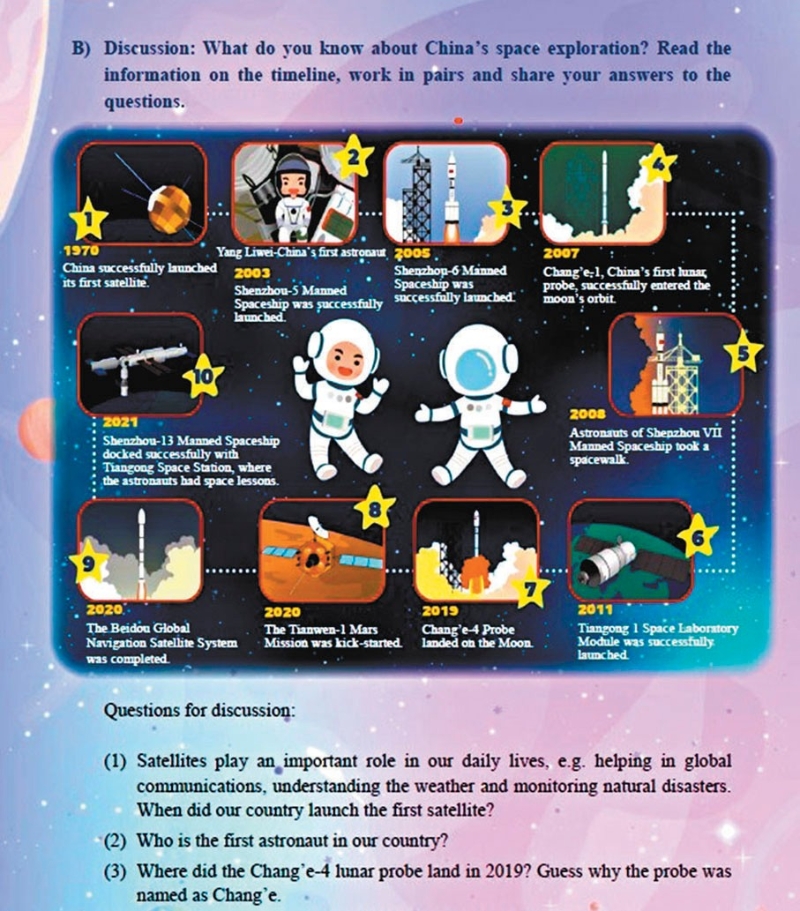 教材內容包括太空探索等主題,幫助小學生豐富英文知識,同時瞭解太空安全等領域。 教材截圖 香港特區政府教育局表示,學校可按學生需要、興趣和能力選取和使用上述學習材料,透過不同主題讓學生學習和應用英語,並培養他們維護國家安全的意識和責任感。而局方亦鼓勵家長跟子女一起閱讀教材內的篇章及觀看相關短片,讓子女課餘期間多接觸英語,加深他們對中華優秀文化和國家最新發展的瞭解。(完) 【編輯:豐悅】