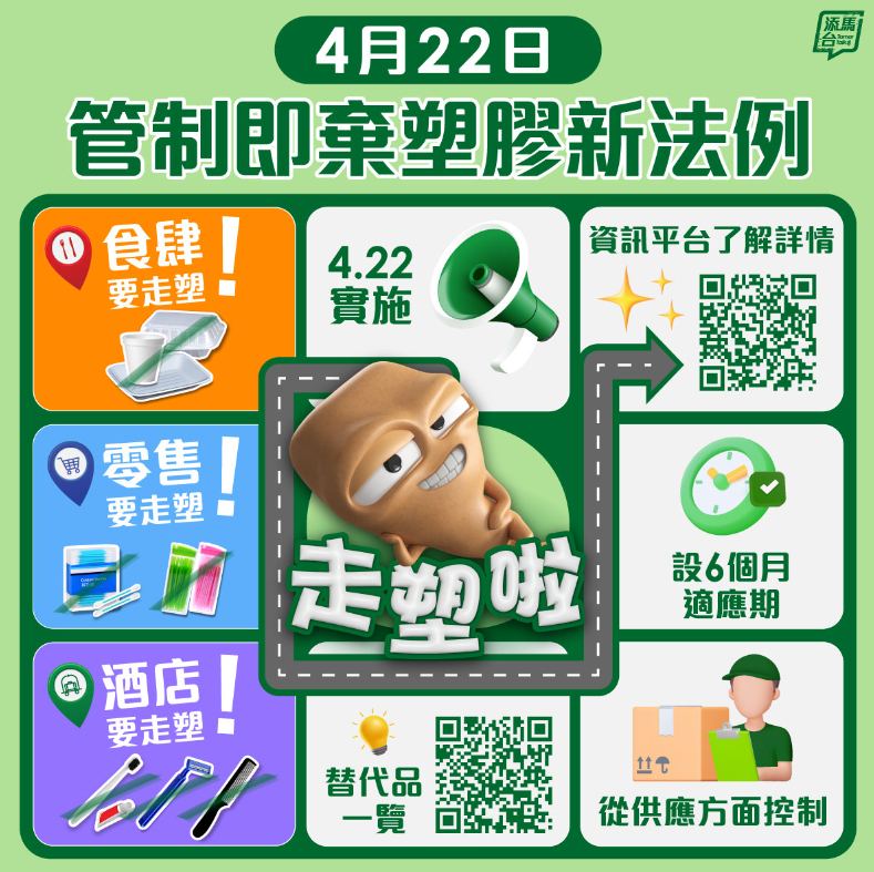 通說:今天,你走塑了嗎?今天,世界地球日,香港正式步入“走塑”新時代。“走塑”,顧名思義,如粵語中的“凍檸茶走甜、走冰”,就是要將一次性的塑料餐具和產品,從生活中趕走…… 根據香港管制一次性塑料的新法例,餐館於4月22日起禁止向外賣客戶銷售或提供發泡塑料餐具、塑料飲料吸管、攪拌棒、刀叉匙和塑料盤子。香港的酒店和賓館不得免費提供塑料牙刷、梳子、小瓶裝沐浴露等一次性洗護用品。