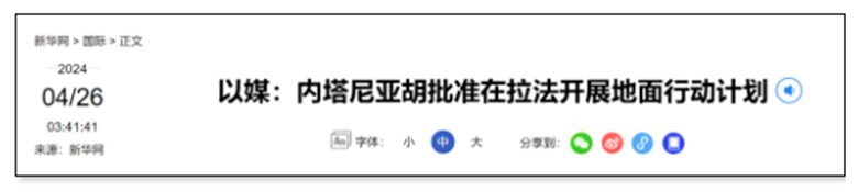 新華社報道截圖 另據多家阿拉伯媒體報道,埃及代表團將於今天(26日)抵達以色列,推動以色列與巴勒斯坦伊斯蘭抵抗運動(哈馬斯)達成停火協議。 據報道,自2023年10月新一輪巴以衝突爆發以來,以軍在加沙地帶由北向南發動地面攻勢,目前戰火蔓延至最南端的城市拉法。目前有超過150萬巴勒斯坦平民在拉法避難。國際社會擔憂,一旦以軍對拉法發動地面行動,將造成更多平民傷亡。