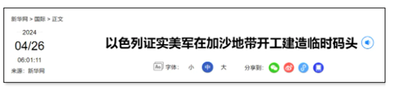 新華社報道截圖 以色列證實美軍在加沙地帶開工建造臨時碼頭 以色列軍方25日晚發表聲明說,美國在加沙地帶開工建造臨時碼頭,以軍提供“安全和後勤支持”。 聲明說,以軍批准了一項由美國中央司令部主導的在加沙海岸建立“後勤走廊”的新倡議,這將為向加沙地帶運送救援物資提供便利。以軍將為碼頭建設提供“安全和後勤支持”。 美國國防部發言人帕特里克·賴德25日在記者會上說,美國軍艦已經開始在地中海靠近加沙地帶的水域建造臨時碼頭和堤道,目前進行的是初期工程。 美國總統拜登今年3月發表國情咨文演講時宣布,美軍將在地中海靠近加沙地帶水域建造一個用於人道主義援助的臨時碼頭。據媒體報道,美軍3月曾派出一艘攜帶建造碼頭設施的後勤支援船前往加沙地帶。 據巴勒斯坦加沙地帶衛生部門25日發佈的數據,2023年10月新一輪巴以衝突爆發以來,以色列在加沙地帶的軍事行動已造成超過3.43萬人死亡、逾7.7萬人受傷。(完) 【編輯:豐悅】