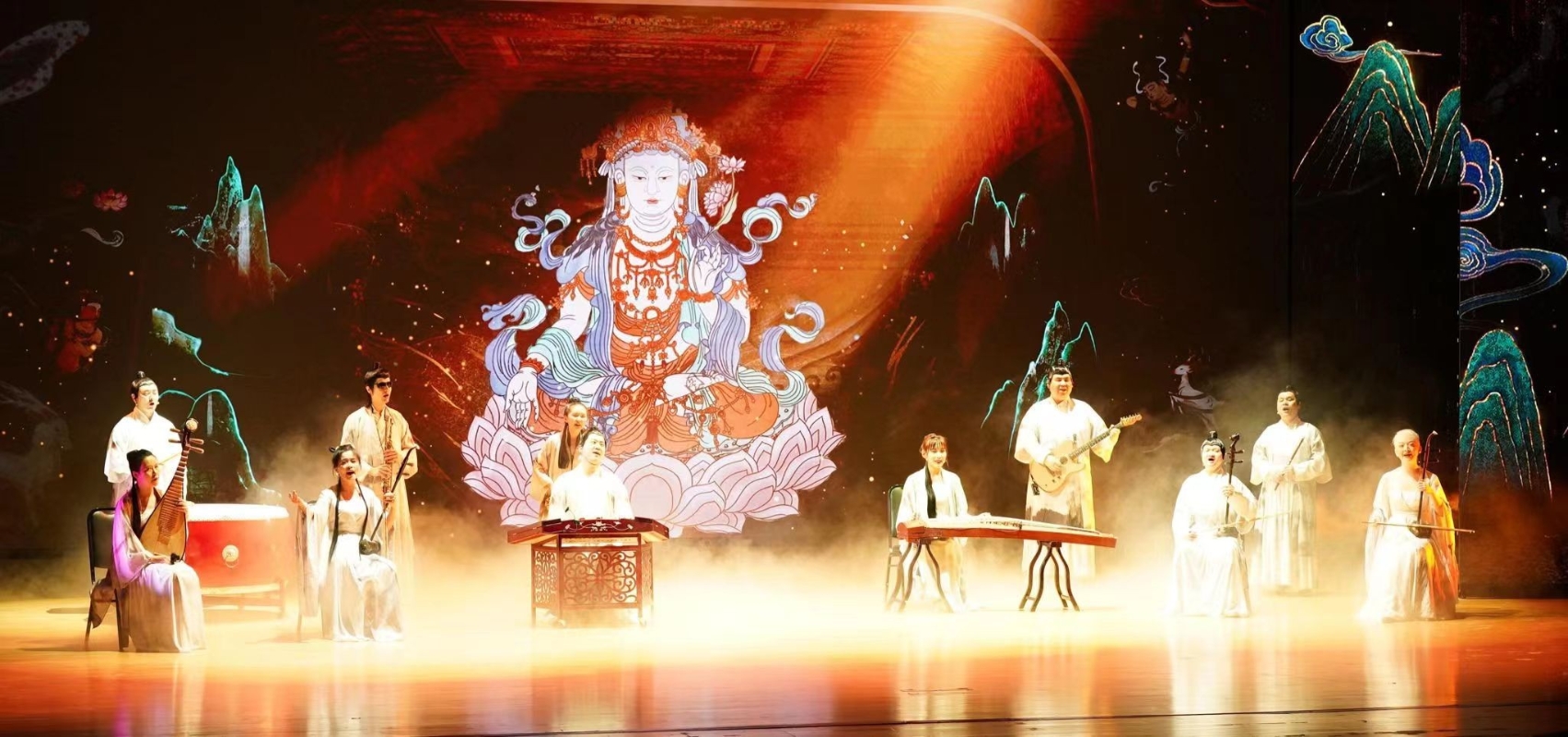 視障表演藝術家一曲大愛,孕育中華文明。(珠海社團總會供圖) 大型情景音畫劇《千手千眼》,是以中國殘疾人藝術團音樂舞蹈詩《我的夢》爲藍本、融合世界文化遺產敦煌壁畫元素創編而成。劇目依託敦煌莫高窟,現存唯一以觀音爲主題的《千手千眼觀音經愛》圖,通過音樂、舞蹈、多媒體等形式創新講述“妙善救父”的民間故事。