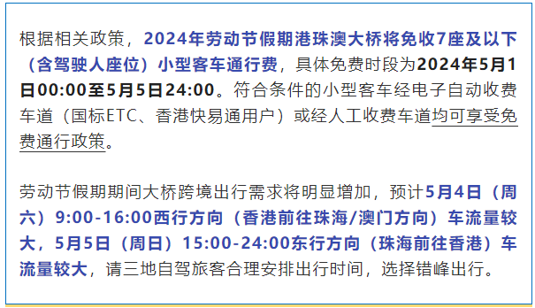 港珠澳大橋統一信息發佈平台 據“港珠澳大橋”微信公衆號消息,2024年5月1日開始的勞動節假期,港珠澳大橋將免收7座及以下(含駕駛人座位)小型客車通行費,符合條件的小型客車經電子自動收費車道(國標ETC、香港快易通用戶)或經人工收費車道均可享受免費通行政策。 勞動節假期期間,港珠澳大橋跨境出行需求將明顯增加,預計5月4日(周六)9:00—16:00西行方向(香港前往珠海/澳門方向)車流量較大,5月5日(周日)15:00—24:00東行方向(珠海前往香港)車流量較大。 (完) 【編輯:錢林霞】
