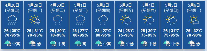 圖源:香港天文台。 下周三(5月1日)即勞動節假期,旅發局將於當日晚上8時在尖東海濱對出海面,舉行首場海上煙火表演,據最新預測當日部分時間有陽光,有幾陣驟雨。 (完) 【編輯:錢林霞】