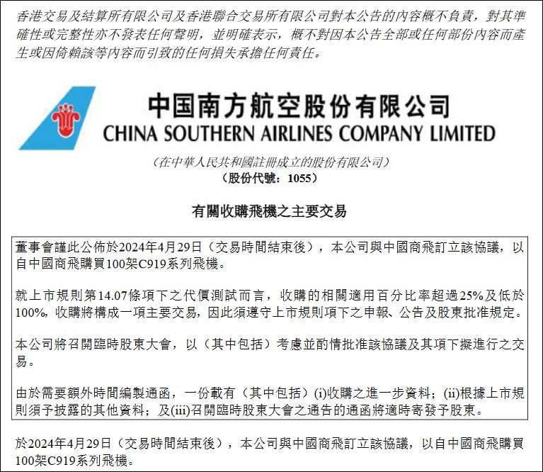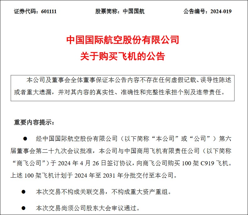 中國南航公告截圖 據公開資料顯示,C919大型客機是中國按照國際通行適航標準研製、具有完全自主知識產權的全球新一代單通道幹線客機,2022年9月29日取得中國民航局型號合格證(TC證),11月29日取得中國民航局生產許可證(PC證)。 2022年12月9日,全球首架C919交付中國東方航空。 另據中國青年報2023年9月報道,中國東航與中國商飛在滬簽署購機協議。東航在2021年簽訂首批訂購5架飛機的基礎上,再增訂100架C919大型客機。 此外,2024年4月26日晚間,中國國航發佈公告宣布,向商飛公司購買100架C919飛機。上述100架飛機計劃於2024年至2031年分批交付至公司。(完)