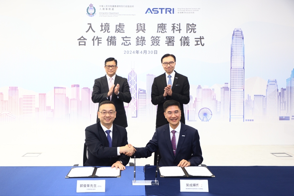 香港特區政府保安局局長鄧炳強(後排左)、香港入境事務處處長郭俊峯(前排左)、香港應科院董事局主席李惠光(後排右)和香港應科院行政總裁葉成輝(前排右)出席簽署儀式
