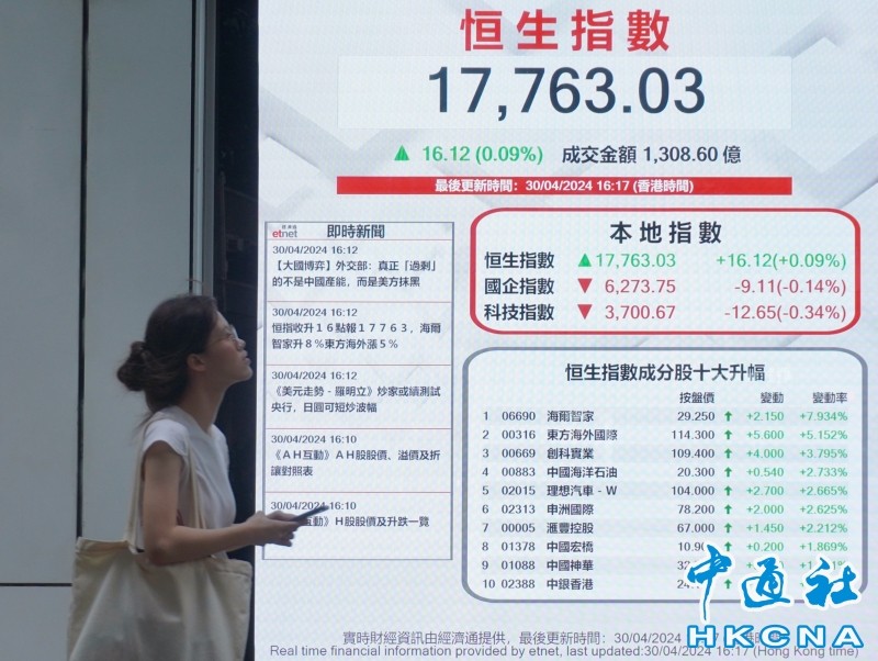 香港中通社4月30日電(記者 陳偉根)港股恒生指數連升第七個交易日,30日收報17763點,7天累飆1538點或9.5%,整個4月則上漲1221點或7.4%,而且過去三個月皆錄得漲幅,共漲2277點或14.7%。