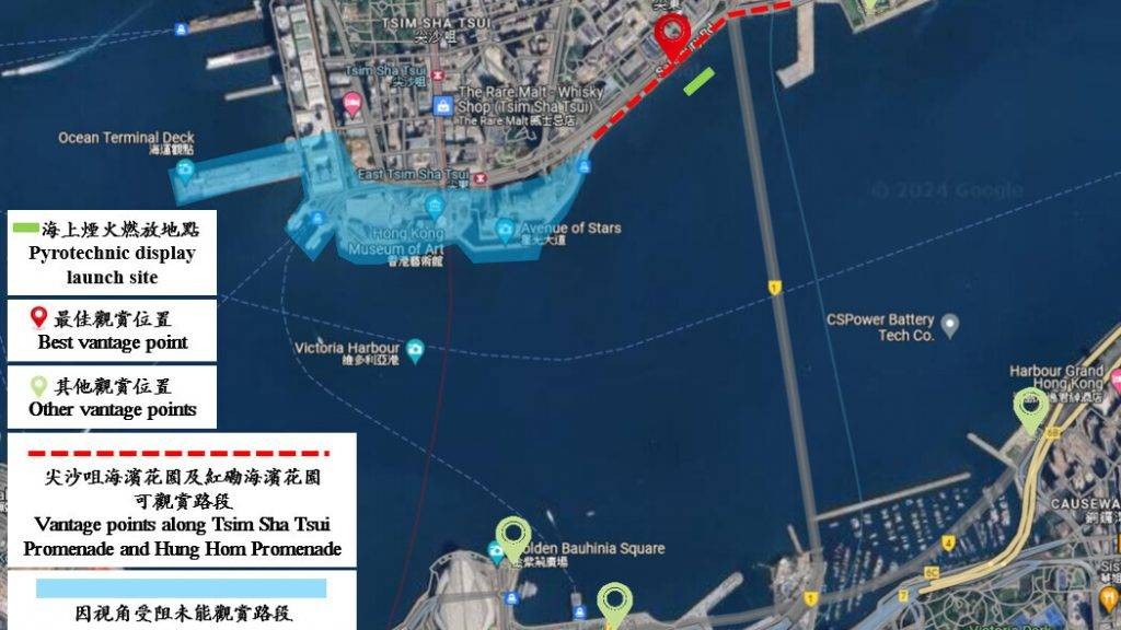 維港煙火表演的最佳觀賞點。(旅發局圖) 今晚上演的維港煙火匯演,會於尖沙咀海濱花園、近尖沙咀東對開維多利亞港海面,展開約10分鐘長的煙火表演,煙火會在離岸130米的躉船發放至水面,最高約100米。是次海上煙火匯演以金色為主,會配合“幻彩詠香江”燈光多媒體匯演,為市民大眾及旅客帶來雙重的視覺效果。