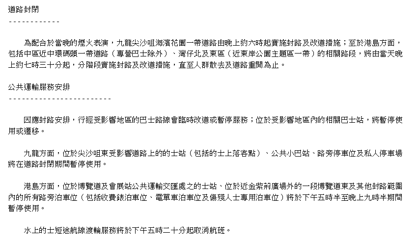 香港政府新聞網 有關特別交通及公共運輸安排詳情,市民還可瀏覽運輸署網頁(www.td.gov.hk)、“香港出行易”流動應用程式或參閱各相關公共運輸營辦商所發出的乘客通告。 受封路影響,運輸署預計有關地區的交通將會顯著擠塞。駕駛人士請避免駕車前往上述受道路封閉影響的地區,如遇交通擠塞,請保持忍讓及小心駕駛,並遵從在場警務人員的指示。 運輸署呼籲市民應盡量使用公共運輸服務,以避免交通擠塞及不必要的延誤。運輸署及警方會密切留意交通情況,並會在有需要時採取適當措施。警方將視乎各區當時的人潮及交通情況,調整有關交通安排。市民請留意電台、電視台或“香港出行易”發放的最新交通消息。 (完) 【編輯:錢林霞】