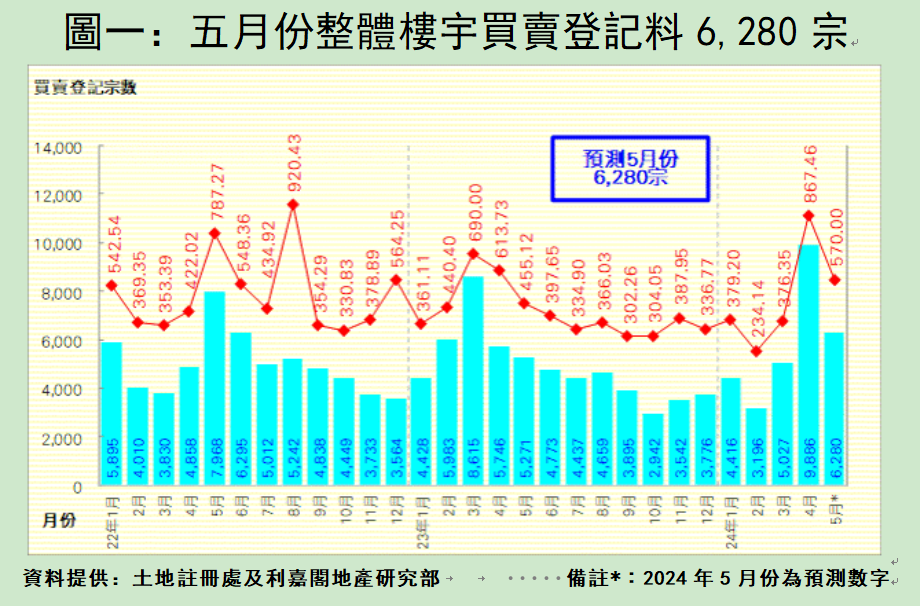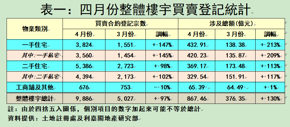 從住宅物業環節分析,上月一手私宅買賣登記量昇幅淩厲,樓市撒辣的因素獲得全面反映,各類買家積極入市,發展商全力推盤的登記陸續到位,帶動四月份一手私宅買賣勁錄3,560宗,按月大增1.45倍,買賣登記總值更激增2.09倍,錄得420.23億元。四月份一手私宅登記量最多的首三個新盤依次為SEASONS PLACE (555宗)、泰峯(339宗)及BLUE COAST (333宗)。 二手住宅市場方面,撤辣效應進一步反映,之前搶先入市的成交魚貫註冊,並於月內推高二手私宅的登記數字。二手私宅買賣繼三月份重越二千宗水平後,四月更一舉突破四千宗水平,共錄得4394宗登記,按月再升1倍(102%),創自2021年八月以來的33個月新高;至於四月份登記總值相應大增1.17倍,錄得329.54億元。