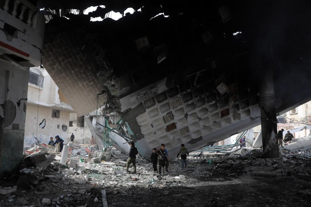 2月12日,人們在加沙地帶南部城市拉法查看建築殘骸。新華社圖片