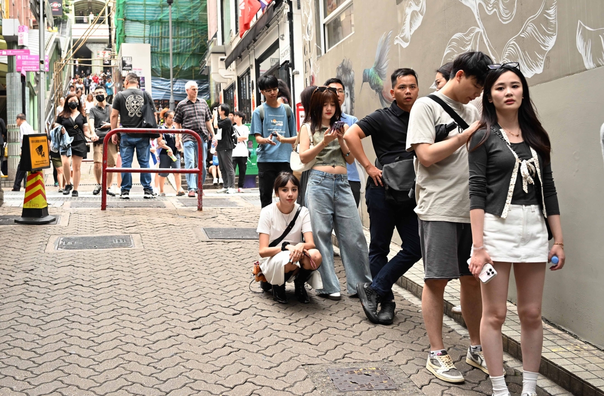 香港新聞網5月3日電(記者洪少葵)5月3日,香港中環舊城有大量遊客摩肩接踵,街頭小巷亦是人頭攢動。內地五一黃金周假期步入第3日,來港的遊客除了扎堆旺角、尖沙咀、銅鑼灣等旅遊熱點,不少年輕一族到港島中上環一些“打卡地”集郵拍照,石板街、大館、荷裡活道、街頭大排檔等別具風情的景點已悄悄躍升為旅客們的心頭好。香港正以其獨特的“港式文化”氛圍,深深吸引著不同遊客。出行預約平台攜程披露數據指,香港列最受歡迎旅遊目的地前三甲,預訂量更按年升51%。