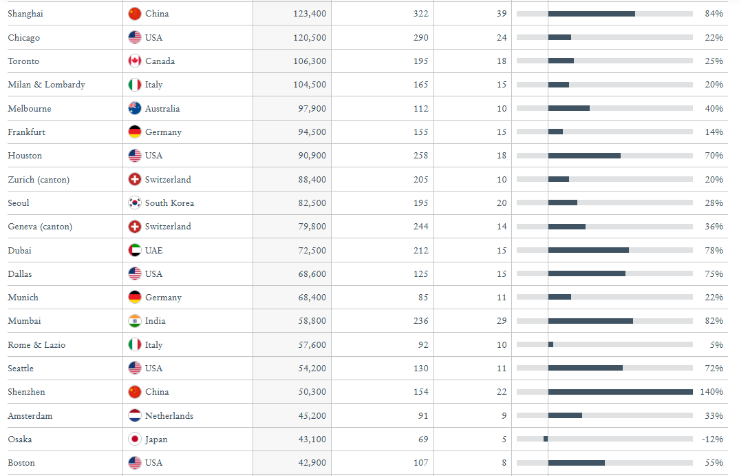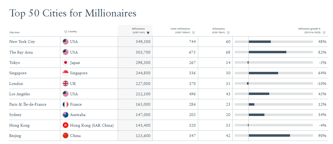 《2024年全球最富有城市報告》由國際財富移民專家Henley & Partners與全球數據情報公司New World Wealth合作每年發佈。報告稱,在流動可投資財富達到或超過100萬美元的居民百萬富翁數量方面,美國處於領先地位,有11個城市進入前50名,其次是中國,有7個城市進入前50名。 報告稱,中國在最新的50個最富有城市排名中佔據了顯著地位,香港特區有143,400名百萬富翁(100萬美元或以上流動可投資財富的個人,下同)北京在過去十年中百萬富翁人口增長了90%有125,600名百萬富翁,首次進入前10名,香港在10年內下降了4位,降至第9位的排名中,上海百萬富翁有123,400人,同期增加84%,位列11。深圳百萬富翁有5,0300人,位列27;杭州有百萬富翁3,1600人,位列36;廣州有百萬富翁2,4500人,位列46,該三座城市百萬富翁增加幅度都在100%以上。 新世界財富研究主管安德魯·阿莫爾斯(Andrew Amoils)表示,深圳是世界上富人增長最快的城市,其百萬富翁人口在過去十年中爆炸式增長140%。“杭州的高凈值居民也大幅增長了125%,廣州的百萬富翁在過去十年中增長了110%。