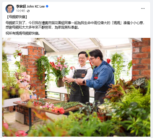 李家超臉書截圖 李家超指,當日在禮賓府與花園組同事一起為自己生命中兩位偉大的“媽媽”準備小小心意,感謝母親和太太多年來不辭勞苦,為家庭無私奉獻,並祝所有媽媽母親節快樂。 特區政府財政司司長陳茂波發網誌表示,祝大家節日愉快,無論是一起餐聚或外出逛街,跟家人親友相聚的時光,都會成為珍貴的回憶。他感激天下母親對兒女毫無保留的愛和無私的付出,希望大家都能和家人開心共聚,並祝母親節快樂、健康平安。 特區政府保安局局長鄧炳強則指12日是個“大日子”,在社交平台中提問“各位囝囝囡囡爸爸,準備好未?”,並附上一張自己包裝母親節禮物的照片。他在文中亦別出心裁,打出3個Hashtag主題標籤表示,“#謝謝妳照顧好家庭”“#不但是我的唯一”“#也是我女兒的唯一”。 特區政府公務員事務局局長楊何蓓茵則表示,感謝母親為她所做的一切;孩子在人生路上邁出的每一步,背後都少不了媽媽的支持和鼓勵。她指,母愛亦在公務員隊伍中發光發亮,不少同事已為人母,一方面用心守護家庭,持家有道,成為兒女最可靠的支柱;另一方面站在服務市民的第一線,用心工作,竭誠將香港建設成一個更美好的家園。她希望大家向母親表達感謝和愛意的同時,亦不忘將敬愛父母的傳統美德傳承給下一代,讓家庭多一點溫馨,多一點愛。 特區政府教育局局長蔡若蓮亦祝願各位母親健康幸福。她指,今天不僅是慶祝的日子,也是一個感恩的機會。“讓我們一起感謝母親無微不至的關懷和照顧,無私奉獻和辛勞付出,用母愛守護我們茁壯成長。”蔡若蓮在祝願中寫道。 特區政府文化體育及旅遊局局長楊潤雄亦發帖祝賀母親節快樂,並配上一幅粉紅色鬱金香的圖片。 人們對於母親的愛意是共通的。母親節當日,這種愛亦在香港官員與市民之間不斷流轉、傳遞。(完) 【編輯:王瑶】