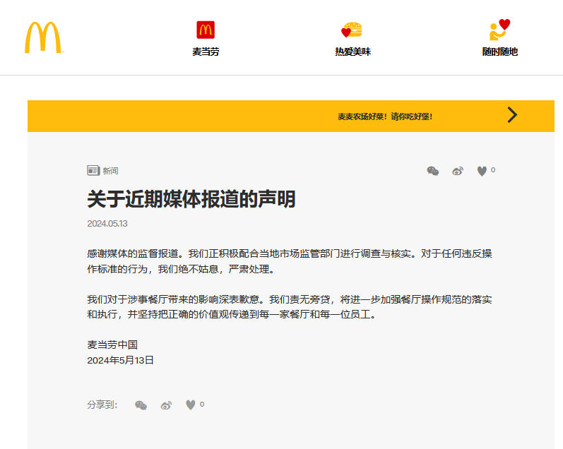 麥當勞中國致歉聲明。麥當勞中國官網截圖 聲明全文如下: 感謝媒體的監督報道。我們正積極配合當地市場監管部門進行調查與核實。對於任何違反操作標準的行為,我們絕不姑息,嚴肅處理。 我們對於涉事餐廳帶來的影響深表歉意。我們責無旁貸,將進一步加強餐廳操作規範的落實和執行,并堅持把正確的價值觀傳遞到每一家餐廳和每一位員工。 麥當勞中國 2024年5月13日 據《中新經緯》此前報道,13日上午10點10分,《中新經緯》分別致電涉事門店“麥當勞鄭州卓越農聯餐廳”和“麥當勞濟南大學餐廳”所屬市場監管部門,相關工作人員均表示“已赴涉事門店進行調查取證”。 “快的話中午之前就能出(調查)結果,最晚今天(13日)下班前。”中國河南省鄭州市鄭東新區市場監督管理局一工作人員向表示。 13日上午9點20分,《中新經緯》致電上述兩家涉事門店,均正常營業。其中,“麥當勞濟南大學餐廳”工作人員表示尚未注意到相關消息,也未接到麥當勞中國總部的相關通知;“麥當勞鄭州卓越農聯餐廳”的工作人員也表示對此事“不清楚”。