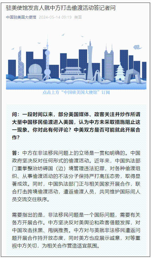 香港新聞網5月14日電 微信公眾號“中國駐美國大使館”5月14日消息,中國駐美使館發言人就中方打擊偷渡活動答記者問。 問:一段時間以來,部分美國媒體、政客關注并炒作所謂大量中國移民偷渡進入美國,認為中方未採取措施阻止這一現象。你對此有何評論?中美雙方是否可能就此開展合作? 答:中方在非法移民問題上的立場是一貫和明確的。中國政府堅決反對任何形式的偷渡活動。近年來,中國執法部門重拳整治妨礙國(邊)境管理違法犯罪,對各種偷渡組織、從事偷渡活動的不法分子保持嚴打高壓態勢,取得顯著成效。同時,中國執法部門正與相關國家開展合作,聯合打擊跨境偷渡活動,遣返偷渡人員,共同維護國際間人員交流交往秩序。 需要指出的是,非法移民問題是一個國際問題,需要有關各方開展合作。中方堅決反對美輿論和政客藉題發揮,對中國攻擊抹黑、甩鍋推責。中方對與美就非法移民遣返問題開展合作持開放態度,同時美方也應展示誠意,對等重視中方關切,為相關合作營造適宜氛圍。