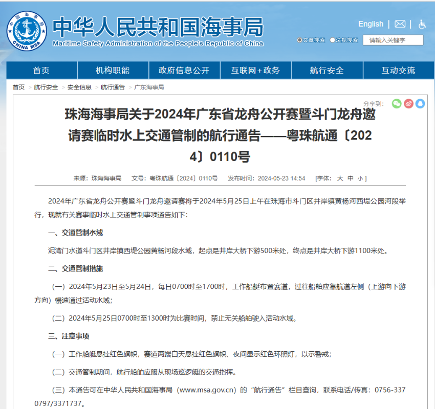 圖源:珠海海事局 另據南方都市報報道,為確保活動期間周邊道路交通安全暢通,從今日(24日)起,交警部門將對西堤路上停放的車輛進行勸離,比賽當天對周邊道路進行交通管制,直至比賽結束。 交通管制措施具體如下:5月24日18:00至次日7:00,西堤路(全球通休閑廣場南街路口至江灣三路口段)、江灣四路(西堤路口至江灣中路口段)路內停車泊位暫停使用,禁止車輛停放。 5月25日7:00至13:00,西堤路(從全球通廣場南街路口至益利名門花壇段)實行臨時交通管制,管制期間,除賽事工作車輛、警車、消防車、救護車、搶險工程車外,禁止其他機動車進入管制區域。過往車輛請繞道行駛,觀眾車輛可停泊在斗門體育公園、江灣路、江灣三路、江灣四路的北側以及江灣中路的西側。 (完) 【編輯:錢林霞】