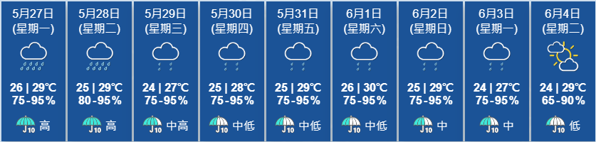 香港新聞網5月27日電 香港天文台今日上午發出黃色暴雨警告信號:香港廣泛地區已錄得或預料會有每小時雨量超過30毫米的大雨,且雨勢可能持續。天文台預報,未來一兩日有驟雨及雷暴,明日雨勢有時較大。 天文台指,一股活躍偏南氣流正為珠江口一帶帶來驟雨及雷暴。此外,一道低壓槽正影響華南。在上午八時,台風艾雲尼集結在馬尼拉之東北約230公里,預料向東北移動,時速約18公里,橫過呂宋以東海域。 本港地區今日天氣預測,大致多雲,有驟雨及狂風雷暴,雨勢有時頗大。最高氣溫約29度。吹和緩南至西南風,風勢間中清勁。 天文台消息,未來一兩日有驟雨及雷暴,明日雨勢有時較大。星期三東風增強。