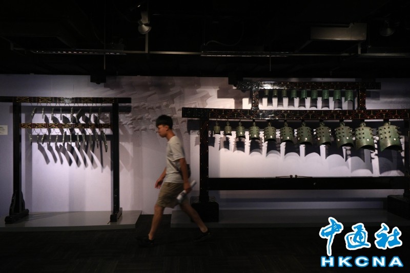 香港中通社圖片 編鐘是周代貴族在宗廟祭祀、宗族宴享等禮儀場合的重要樂器。展覽現場,有遊客詢問能否嘗試敲擊外部編鐘,對編鐘正面鉦間和銑部鑄有的銘文也頗為好奇。(完) 【編輯:王瑶】