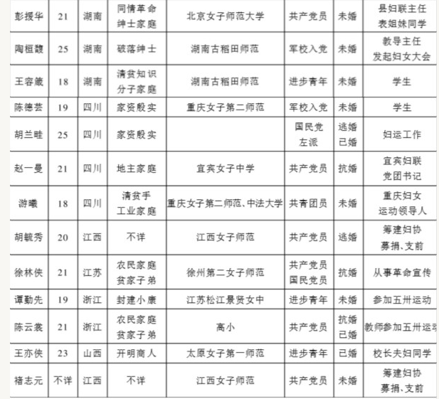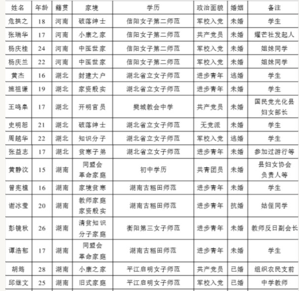分析上表中的30名女兵情況,可初步歸納出以下特點:第一,雖然年齡跨度較大,但整體偏年輕化(按規定,招收女兵的年齡是18歲以上20歲以下,實際上很多人超過了20歲)。第二,從地域上來說,她們來自全國各地,但以兩湖和四川居多。第三,家庭出身涵蓋面甚廣,有工人、城市貧民、農民、知識分子、商人、地主、鄉紳、官僚等多種出身,多數是中等或中等以上的家庭。第四,文化程度多數為中等學校以上或同等學歷,也有大學畢業或者肄業的,整體的文化素質較高。第五,政治面貌複雜,但以中國共產黨黨員居多。第六,女兵中未婚女性居多,且她們的婚姻狀況極具反抗色彩。