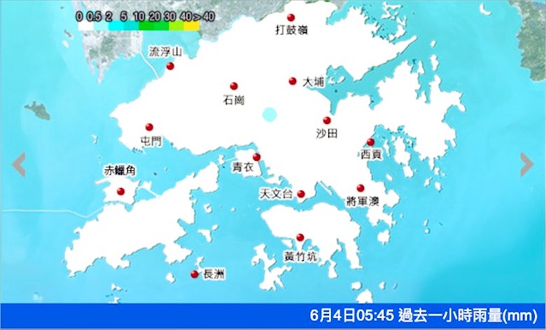 香港天文台6月4日清晨5時45分各區前一小時雨量。圖自香港天文台網站 香港天文台指,一股達強風程度的偏東氣流會在未來兩天影響廣東沿岸地區,該區風勢較大。同時,一道低壓槽會為華南地區帶來雷雨。預料偏東氣流會在本周中後期逐漸被一股偏南氣流取代,下周初廣東地區天氣炎熱,天色較為明朗。