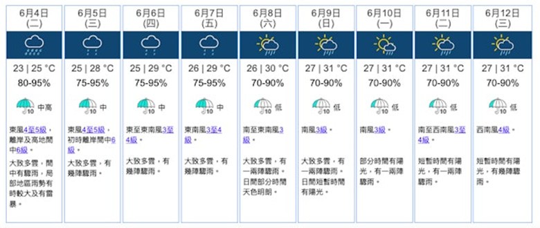 未來九天天氣預報。圖自香港天文台網站 周六(8日)至下周一(10日)端午節的一連三日“端午小黃金周”,仍然大致多雲,有一兩陣驟雨,周日(9日)至下周三(12日)或部份時間有陽光。其中周六(8日)最高氣溫可達30℃,周日(9日)至下周三(12日)均介乎27-31℃,請市民注意防暑。(完) 【編輯:豐悅】