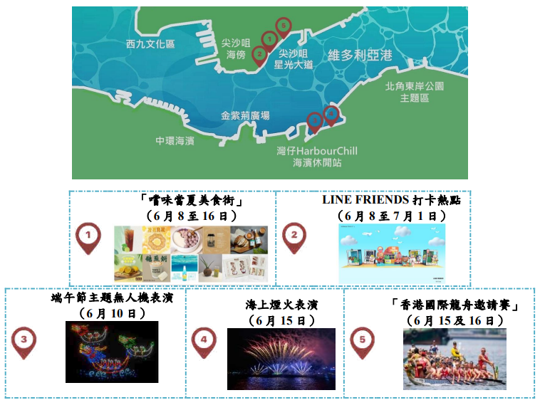 香港新聞網6月5日電 6月盛事歡樂連場!香港旅遊發展局承6月端午節慶,於維港兩岸推出5大精彩活動。頭炮於6月8日登場,尖沙咀星光大道進駐多個消暑美食檔及LINE FRIENDS全新打卡熱點;6月10日及15日,灣仔分別有端午節主題無人機及海上煙火表演;6月15及16日一連兩天,尖東海旁則有年度盛事“香港國際龍舟邀請賽”壓軸上演。