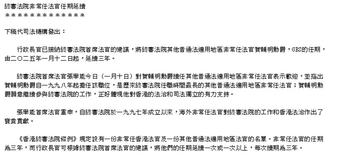香港中通社圖片 政府不會對岑耀信勳爵所提到正在進行的法律程序發表其他評論,但有必要指出在串謀顛覆國家政權案中,原訟法庭裁定立法會議員應依據《財政預算案》及公共開支議案的利弊,作審核和通過的考慮;為迫使政府同意政治要求,無差別否決政府的《財政預算案》或公共開支議案,迫使行政長官解散立法會及最終請辭,使特區政府無法為市民福祉制定新政策或執行現有政策,明顯違反《基本法》第七十三條規定的憲制責任,屬濫用權力,構成顛覆國家政權罪的非法手段。如果任何人對原訟法庭的判詞作出錯誤解讀並向上訴法庭施壓,意圖干擾司法程序,特區政府不能坐視不理,必須發聲以正視聽。 香港特區憲制秩序保障獨立行使審判權 每個主權國家都享有國際公法下的固有權利,選擇最符合當地實際情況和人民整體利益的憲制秩序、政治及法律度。《憲法》與《基本法》確立的香港特區憲制秩序,是以“一國兩制”方針為基礎。根據《基本法》第二條,全國人民代表大會授權香港特區依照《基本法》的規定實行高度自治,享有行政管理權、立法權、獨立的司法權和終審權。雖然國家安全不屬於香港特區的高度自治範圍内,但《香港國安法》授權香港特區法院就絕大多數的危害國家安全犯罪案件行使管轄,既體現了“一國兩制”方針,也展示了中央充分信任香港特區法院能夠依法獨立進行審判,履行維護國家安全的憲制責任。 司法機關最根本的職能是依據法律秉行公義。這意味着在任何一個法律制度下,法院的管轄權都是由其法律制度的憲制秩序和法律作出界定。例如,英國實行的憲制模式是議會主權,其國會具有至高無上的地位,而英國法院無權推翻國會通過的任何法例,儘管法院認為有關法例違反人權原則。在美國,美國憲法第三條第二款授權國會訂立規例限制美國最高法院的管轄權。沒有人會認為,僅僅是因為法院的管轄權在該等情況下受到規限,法院便無法獨立行使審判權。 香港特區的司法制度受《基本法》保障。《基本法》第二條、第十九條及第八十五條訂明,香港特區享有獨立的司法權和終審權,法院獨立進行審判,不受任何干涉。所有法官和司法人員緊守司法誓言,以無懼、無偏、無私、無欺之精神,嚴格根據法律原則,維持司法公義。法官在處理危害國家安全犯罪案件時,一如其他案件,都是獨立公正地履行司法職責,不受任何干涉。 近期的案件清晰地展示了香港特區一如既往繼續獨立行使審判權。按照公開司法的原則,法院的判決詳細地説明了法院對法律和證據的分析,以及基於甚麼原因達致其結論。例如,原訟法庭在串謀顛覆國家政權罪案件的裁決理由書超過300頁,並有兩個共超過400頁的附件歸納控辯雙方證人證供。上訴法庭就律政司司長申請臨時禁制令以禁止與一首歌曲有關的四項刑事行為所作的判決,超過60頁,並援引了大量案例,當中包括英國最高法院的案例。任何合理、客觀和公正的人,如果有細閲這些公開的判決,都肯定會信服法官是獨立進行審判,並嚴格依照法律和證據判案,不受任何干涉,絲毫沒有偏離其責任。 值得注意的是,儘管郝廉思勳爵辭去香港終審法院的職位,但他表示“對法院及其成員的獨立性充滿信心”。而麥嘉琳法官近日表示在其非常任法官任期屆滿後會退休時,也重申“對法院的成員、其獨立性和維護法治的決心抱有信心”。特區政府對麥嘉琳法官在任內對香港司法制度的貢獻和對香港法治的客觀評價表示謝意。 事實上,在2021年3月,岑耀信勳爵拒絕參與英國政府鼓動針對香港司法機構的政治杯葛時,也表達了類似看法,更承諾香港法官“應受到他們的海外同儕支持,而非被背棄”。現在岑耀信勳爵卻選擇背棄香港特區的法官,實在令人極度失望。 香港特區法院現時面臨對其獨立行使審判權的真實威脅,事實上來自外國的政府官員、政客和政治性組織,包括公然企圖干預法律程序,以及由於法官在履行司法職能時就案件作出這些境外勢力不喜歡見到的判決,便威脅對法官實施“制裁”的可恥行為。這些行為明顯違反國際法和國際關係的基本準則。岑耀信勳爵一方面認為美國對香港法官的“制裁”威脅屬不公義,一方面卻對香港法官的司法工作作出如此不公正的評價,實在令人驚訝。一直以來,每當境外或境內勢力向法院作出惡毒攻擊和詆毀,香港特區政府都毫不猶豫捍衛法院獨立行使審判權。岑耀信勳爵似乎也對這個客觀且無可置疑的事實視而不見。 行政長官李家超說:“特區政府從未、亦不會容許任何人干預律政司的檢控工作和法院的審訊,一直尊重及維護其獨立檢控權和獨立審判權,該兩項權力受《基本法》全面和肯定的保障。律政司的檢控決定從來不受任何干涉,同樣地,法院一直獨立進行審判,不受任何干涉。過去是、現在是,將來也是,香港法治固若金湯,歷久不變。” 全國人大常委會解釋法律符合“一國兩制”原則 全國人民代表大會常務委員會解釋《基本法》及在香港特區實行的全國性法律的權力,是“一國兩制”原則下的重要一環,並早已在香港特區的法理中確立。根據《基本法》第158條,香港特區法院獲授權在審理案件時對《基本法》的條款作出解釋,而《基本法》的最終解釋權則屬於全國人大常委會。正如香港終審法院其他普通法適用地區非常任法官梅思賢爵士在劉港榕對