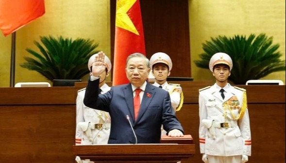 2024年5月22日,蘇林在越南首都河內宣誓就任越南國家主席。圖自新華社 蘇林當日在河內會見中國駐越南大使熊波時表示,越中是山水相連的友好鄰邦,當前國際地區形勢深刻複雜演變,雙方比任何時候都更需要加強團結合作,維護共同戰略利益。越方願同中方一道,保持高層密切往來,推動各領域合作提質升級,加快跨境鐵路等基礎設施互聯互通,加強傳統友好宣傳,更好管控分歧,推動越中全面戰略合作夥伴關係行穩致遠。 熊波表示,中方堅定支持越南保持穩定,加快發展,願同越方堅持兩黨最高領導人戰略引領,攜手走好符合各自國情的社會主義道路和各具特色的現代化道路,維護雙方共同戰略利益,推動具有戰略意義的中越命運共同體建設走深走實,為兩國人民謀幸福,為人類和平、發展與進步事業作出更大貢獻。 蘇林,1957年7月生於越南北部興安省,是越共第十二屆、十三屆中央政治局委員,長期在越南公安部任職,2016年4月起任公安部長。他曾多次訪華。今年5月22日,經越南第十五屆國會第七次會議投票表決,越共中央政治局委員、公安部長蘇林當選新任國家主席,隨後宣誓就職。(完) 【編輯:梅婉潼】