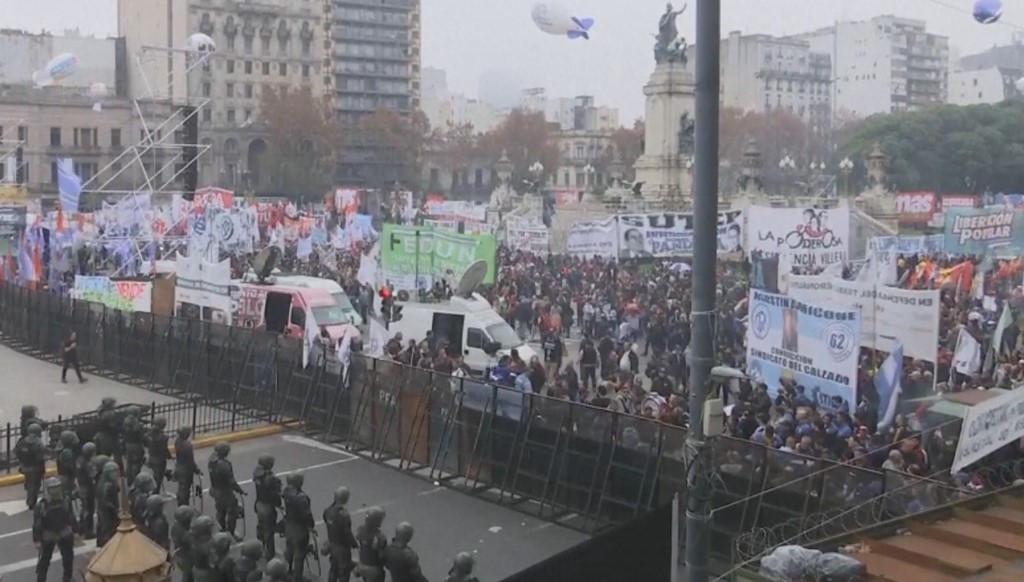 6月12日,阿根廷布宜諾斯艾利斯,大批示威者在國會大樓外抗議。視頻截圖 數千名示威者當天在首都布宜諾斯艾利斯國會大樓外抗議,企圖佔領大樓外的主要街道,防暴警察用胡椒噴霧及水炮驅趕人群。 參議院當天開始辯論米萊提出的兩項改革法案,一項是降低所得稅起徵點的稅收方案,另一項是包含238條的州改革法案,該法案最初因其包含600多個條款而被稱為“綜合法案”。 2月時,旨在通過私有化國有實體和為企業提供激勵措施來促進投資的綜合法案,在首次國會投票中被否決,多次修改後才在4月通過阿根廷眾議院。 當地立法者和媒體認為,阿根廷參議院對該法案的意見分歧也很大。而這一次投票也被視為迄今為止對米萊政治願景和治理話語權最嚴峻的一場考驗。就在這場投票進行的同時,數千名示威者聚集在阿根廷布宜諾斯艾利斯市中心,敦促參議員拒絕這項計劃。 法案要在72席的參議院中,獲得37票支持才可通過,但米萊領導的自由前進黨,在參議院只佔少數,有親政府的參議員估計,法案只有36票支持,需要參議院議長、副總統比利亞魯埃爾投下決定性一票。(完) 【編輯:梅婉潼】