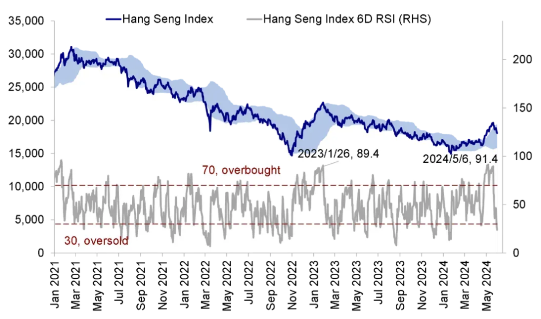 圖表:港股市場當前接近超賣區域。資料來源:Wind,中金公司研究部 Kevin策略研究認為,4月中旬以來市場港股漲勢主要受資金面和風險偏好改善驅動,在基本面未有明顯變化的情況下,這一資金性質和反彈驅動特徵會使市場在短期超買後面臨一定獲利回吐壓力。即恒指19,000-20,000點附近,對應風險溢價回落至2023年初市場高點的水平,市場會面臨一定獲利回吐壓力。不過目前政策邊際變化、海外資金回流以及估值修復都有切實的改善。市場逐步回歸現實與基本面後,或在恒指18,000點附近震盪盤整,等待更多新的催化劑。 中泰國際表示,港股通全周流入269.6億港元,繼續支撐港股。當前AH溢價指數已回升至2020年以來52.8%分位數的位置,吸引內資南下。 之所以資金沒有因6月FOMC後美債利率下行而加速流入港股,因為美元指數創超過一個月以來新高,美聯儲保持定力,叠加日本央行議息結果不及預期,均推動美元指數向上,使得大宗商品及港股仍受承壓。中泰國際認為,恒生指數在17,500點會有較大支持,短期對資源及航運股謹慎,看多半導體、消費電子、食品飲料、體育用品。另外,股價持續調整的內銀股及有回購支撐的互聯網可趁機吸納。能源、電訊、公用事業仍然是核心持倉。 中金公司認為港股比A股依然具有比較優勢,體現在:1)估值偏低,不論是高分紅還是科技成長;2)港股對流動性更敏感,且海外資金配置比例也處於低位。截至4月底整體外資對中資股的配置比例從2021年初的15%降至5%,且低於被動比例1ppt;3)盈利較好的周期和互聯網等板塊在港股中占比更多,盈利承壓的地產與製造鏈條多數集中在A股。此外,若美聯儲年內開啟降息,聯繫匯率制下港股也將較A股更為受益。 (風險提示:以上內容僅供參考,不構成投資建議。) (完) 【編輯:錢林霞】