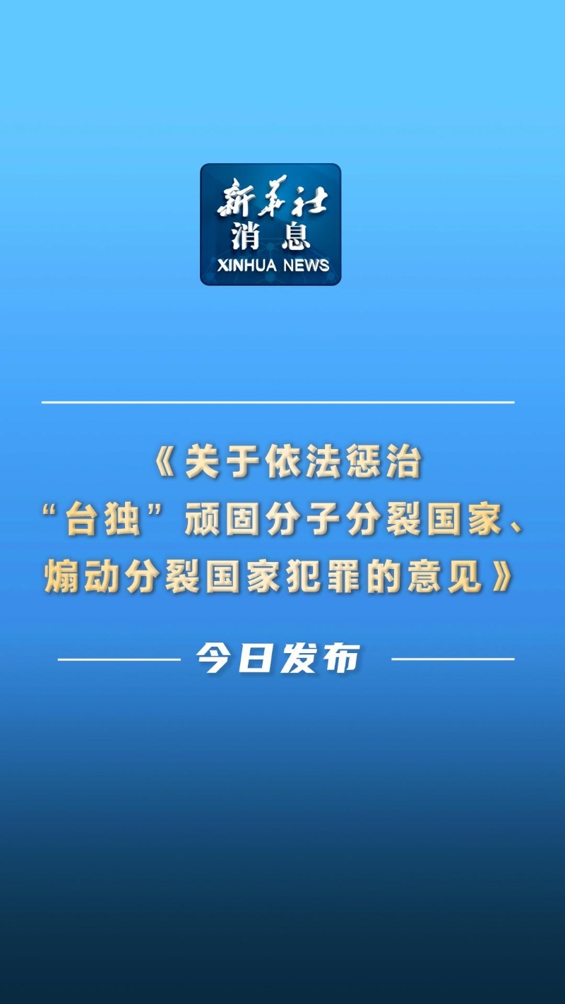 香港中通社6月21日電 6月21日,中國最高人民法院、最高人民檢察院、公安部、國家安全部、司法部聯合發布《關於依法懲治“台獨”頑固分子分裂國家、煽動分裂國家犯罪的意見》,自發布之日起施行。