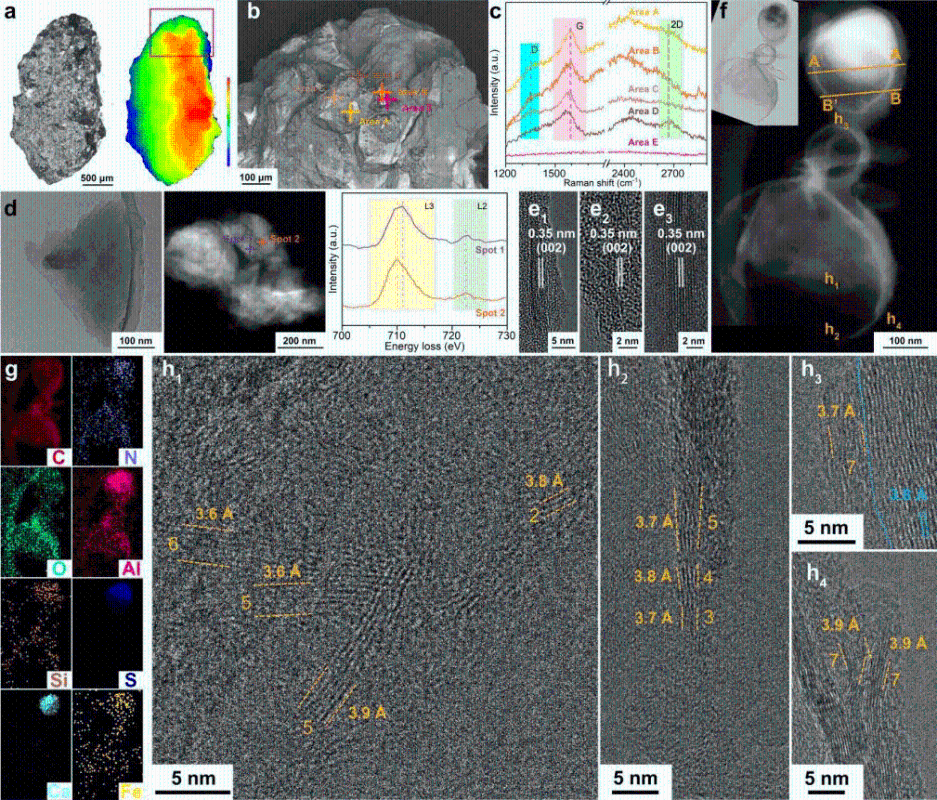 圖1 CE-5月壤樣品中天然石墨烯的先進電子顯微結構表征和譜學分析 過往報道指出,通過觀測月球的全球碳離子通量,科研人員認為月球上存在原生碳,利用月球樣品的表征研究來揭示原生碳相的晶體結構是可行的。石墨烯以其新奇的物理現象和非凡的特性,在包括行星和空間科學在內的廣泛領域發揮著越來越重要的作用。據估計,星際碳總量中約1.9%是以石墨烯的形式存在,其形態和性質由特定的形成過程決定,因此天然石墨烯的組成和結構特征將為星體的地質演化和月球的原位資源利用提供重要的參考和信息。