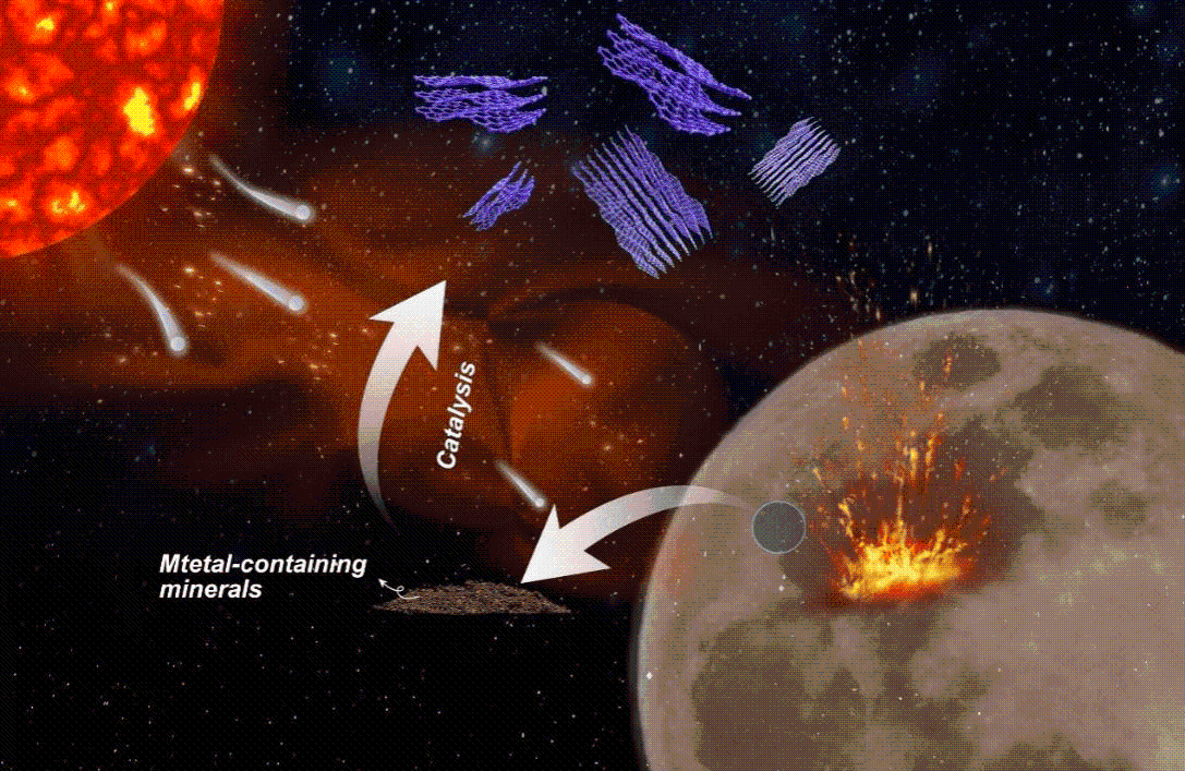 圖2 少層石墨烯在月球上可能形成過程 在該項研究中,科研團隊採用電鏡—拉曼聯用技術,在月壤樣品含碳量相對較高的位置採集了拉曼光譜,確認了月壤樣品中石墨碳的結晶質量相對較高。值得注意的是,月壤樣品中存在碳的區域含有鐵化合物,這與石墨烯的形成密切相關。通過掃描電子顯微成像、透射電子顯微成像、冷凍條件下球差電鏡的高角環形暗場像和高分辨像、能譜和電子能量損失譜、飛行二次質譜等多種表征技術的綜合運用及測試結果的多方面嚴謹比對分析,探究并證實了月壤樣品中檢測到的石墨碳是少層石墨烯(2—7層),并提出少層石墨烯和石墨碳的形成可能源於太陽風和月球早期的火山噴發共同誘導的礦物催化進程。 吉林大學材料科學與工程學科張偉教授為本文第一作者,工程仿生教育部重點實驗室鄒猛教授、李秀娟正高級工程師及中國科學院金屬研究所瀋陽材料科學國家實驗室任文才研究員為本文的共同通訊作者。吉林大學電子顯微鏡中心測試分析表征團隊,物理學院、超硬材料國家重點實驗室協同極端條件高壓科學中心對該項研究工作給予了大力支持。研究成果由中國科學院金屬研究所馬來鵬研究員,吉林大學張銳教授、李新陽副教授、鄭偉濤教授、周強教授、李芳菲教授、劉紅艶研究員,國家深空探測實驗室胡震宇研究員,探月與航天工程中心柳驪研究員等共同合作完成。相關工作得到了國家探月中心的月壤樣品寶貴支持和國家基金委面上項目資助。(完) 【編輯:丘志彬】