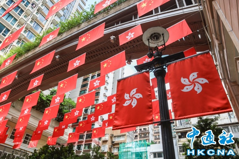 香港中通社6月25日電(香港中通社記者 譚暢)臨近7月,香港將迎來回歸祖國27周年紀念日。大片大片奪目的“中國紅”,躍然於香港大街小巷上,傳遞著回歸紀念日將至的喜悅。 中通社記者看到,香港或長或短的行人天橋上方,已整齊排列懸掛著中華人民共和國國旗與香港區旗。紫荊花和金黃的五星攜手相伴,成百上千面以大紅為底色的旗幟迎風飄揚,似正訴說香港“由治及興”的凌雲壯志。 尖沙咀的大型商場外,成片“紅色海洋”,國旗和區旗在人們頭頂用透明線高高掛起,營造成了一條紅色喜慶“走廊”。市民遊客漫步其間,不時有人拍照打卡,十分有氣氛。 在灣仔香港入境處的大樓外,與大樓齊寬的巨型海報上寫“慶祝香港特別行政區成立二十七周年”閃亮登場。海報的四個角為紫色,彷彿香港維港兩岸藍紫的夜空,同時還有朵朵煙花綻放;從四角到中心處,顏色由紫漸向橙色過渡,為大樓添繽紛。