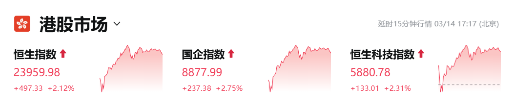 香港新聞網3月14日電 港股三大指數集體拉升,出現了科技股、大金融、消費股普漲行情!截止收盤,恒生指數漲2.12%盤中重回24000點,更是止步5連跌行情,恒生科技指數、國企指數分別上漲2.31%及2.75%。分析人士認為大漲受三大利好因素的影響。