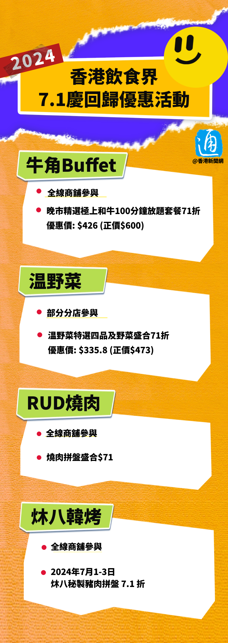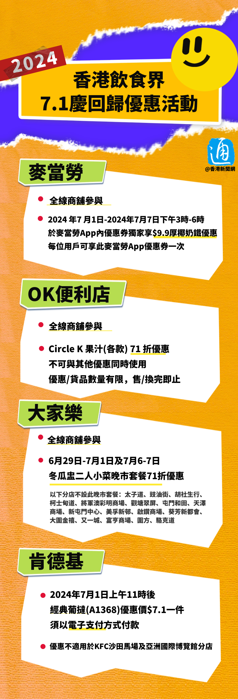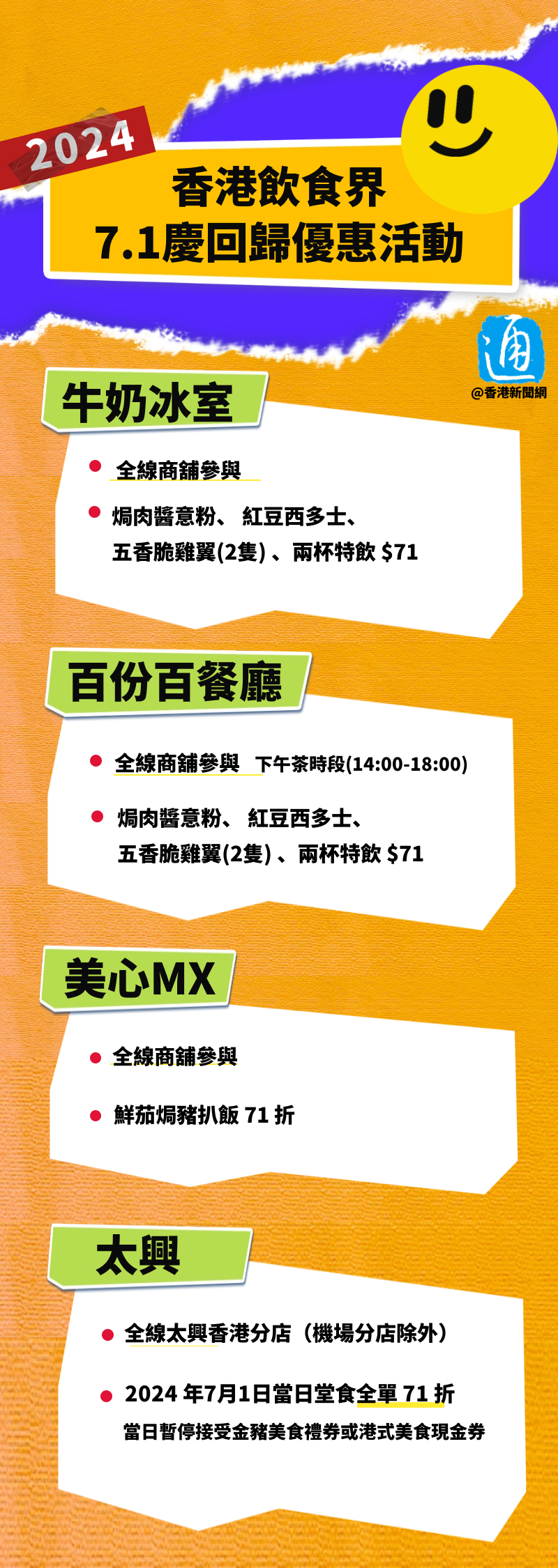 香港新聞網6月26日電 為慶祝香港回歸祖國27周年,香港飲食界舉辦“7.1慶回歸優惠活動”,全港約2000間商戶參與其中。參與活動的商戶會在7月1日當天,就指定菜式或套餐提供七一折優惠,或以指定優惠價出售指定食品。 是次活動由香港飲食業聯合總會、現代管理(飲食)專業協會等8個飲食界商會聯合主辦。參與商戶包括麥當勞、肯德基、OK便利店、大家樂、美心、牛角、太湖海鮮城酒家等。戳圖了解,這些商戶的優惠詳情↓↓ (詳細名單:https://www.hksar27.gov.hk/public/pdf/special-offer/SO-CI.pdf)