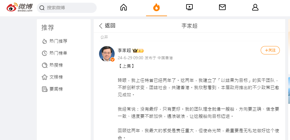 李家超在社交平台發微博及視頻分享上任兩周年心得。 李家超微博原文如下: 轉眼,我上任特首已經兩年了。這兩年,我建立了“以結果為目標”的實幹團隊,不斷創新求變,團結社會,共建香港。我欣慰看到,本屆政府推出的不少政策已愈見成效。 我經常說:沒有最好,只有更好。我的團隊理念就像一艘船,方向要正確、信念要一致、速度要不斷加快,遇浪破浪,讓這艘船向目標邁進。 回顧這兩年,我最大的感受是責任重大,但使命光榮,最重要是無私地做好這個使命。 一連兩天,我會透過影片和大家分享我的一些想法,也想藉此感謝我的團隊,以及社會各界的支持。 展望未來,政府會繼續做好搭台和導演角色,為香港創造機遇;不同業界亦要各展所長,演好自身角色。讓我們繼續努力,一起建設更美好的香港! (完) 【編輯:錢林霞】