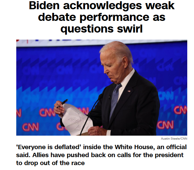美國有線電視新聞網圖片。 紐約時報以:“換人?拜登災難級辯論表現引發民主黨恐慌“為題的報導說,在90分鐘的辯論中,聲音沙啞的拜登無法清楚表達自己的論述,難以抗衡謊話連篇卻口齒伶俐的前總統特朗普。這讓人懷疑現任總統拜登,是否有能力於大選前4個月進行激烈的競選活動。 报道说,78歲的特朗普在辯論中似乎游刃有餘,儘管他滔滔不絕地說出一個又一個謊言,卻沒有受到任何有效的質疑。他顯得信心十足,同時避免了在2020年與拜登的第一次辯論中損害他的那種過分霸道的舉止,似乎認為讓對手深陷在自己的困境之中就足够了。 華爾街日報(The Wall Street Journal)則以“拜登首場總統辯論表現不佳,民主黨人私下討論更換候選人“為題報導,其中提到幾個月來,許多民主黨人士都認為拜登適合連任總統。但這場辯論結束後,一些民主黨的策略顧問、捐款者等人士表示,他們對拜登辯論表現感到震驚,并稱拜登的表現引起有人私下討論另尋人選取代他角逐總統。但他們也承認,拜登退選的可能性依然很小。 報道還說:面對各界對於辯論表現的擔憂以及要求拜登退選的呼聲,拜登都不予理會。辯論結束後,他前往用餐時告訴記者:“我認為我們做得很好。” 拜登還說:很難和一個騙子辯論。他指的當然是特朗普。 美國有線電視新聞網(CNN)消息稱,拜登的表現打破了人們對這一群體的信心,很快就變成了恐懼,即唯一有能力改變競選活動的人自己也無法勝任。對核心圈子的挫敗感越來越大。一位白宮官員表示,週五的群發短信“糟糕透頂”。“每個人都洩氣了,”這位官員說。 81歲的拜登一直沒有消除外界對他年齡的疑慮,這次辯論讓這一點成為無法迴避的核心問題。對高齡總統拜登的能力問題,民主黨人和拜登政府成員幾個月來一直為其辯護,而正是這些人在辯論開始幾分鐘內就瘋狂地通過電話和短信交流,因為很明顯,拜登并沒有處於最佳狀態。一些人在社交媒體上對他的糟糕狀況表示震驚,而另一些人則私下討論這對民主黨意味著什麼,以及說服總統讓位給更年輕的候選人是否為時已晚。 紐約時報說:一位曾公開堅定支持拜登的資深民主黨幕僚說道:拜登將面臨越來越多要求他讓位的呼聲。民主黨人對他有著深厚的感情,現在這感情已經乾涸。政黨的存在就是為了獲勝……那個和特朗普同台的人不可能贏。 (完) 【編輯:錢林霞】