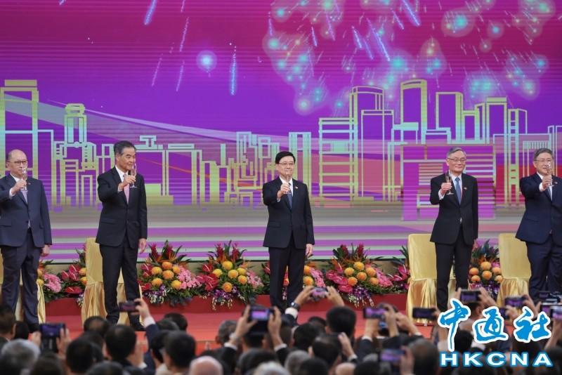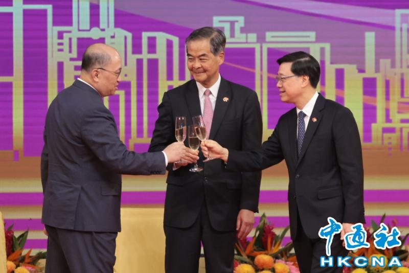 圖為香港特區行政長官李家超與全國政協副主席梁振英、香港中聯辦主任鄭雁雄祝酒。(香港中通社記者 謝光磊 攝) 香港中通社圖片 全場在特首致辭完畢後響起熱烈掌聲,大家為國家富強康盛,為香港繁榮安定舉杯共慶。