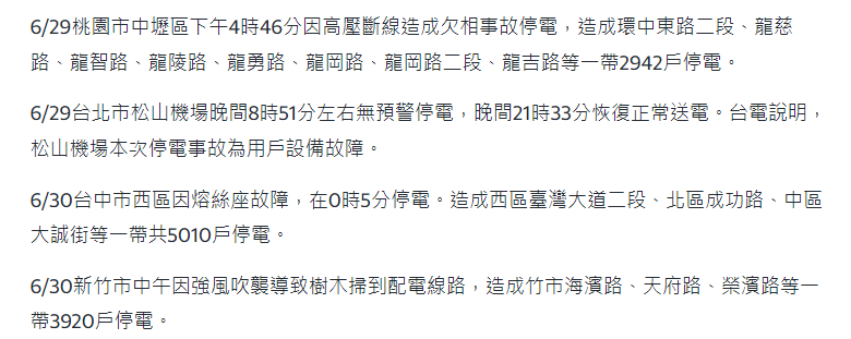 台媒報道截圖 持續高溫之下,台灣出現多起熱中暑、熱衰竭的案例。據台衛福部門最新統計,台灣6月熱傷害人次高達741人次,超過去年6月517人次,同比增長40%。而7月1日-2日,已有45人次因熱傷害就醫。 大多數台灣民眾選擇開空調以抵抗高溫。於是,7月才進入第二天,台灣的用電就創新高。台電數據顯示,2日下午1時52分,尖峰用電量4118.1萬千瓦,刷新歷史紀錄。台經濟部門預估今年的尖峰負載為4119萬千瓦,時間預估在7月底,但實際狀況恐是超乎預期。 用電經受高溫考驗的同時,台灣各界對“缺電”“停電”的討論也如火如荼。 桃園市4月停電35次的消息過去還沒多久,有台媒整理近一個月全台停電次數,發現從6月2日到7月2日間,竟也有25次停電事故。6月底台電宣稱“7月不缺電”,但從1日至今,每天都有停電事故。今天(4日)凌晨,台中市停電兩小時,上千戶受影響。難怪台灣網友表示,“真實的停電數據只會更多”,“幾乎天天都在跳電”,“每天都在輪流停電”。