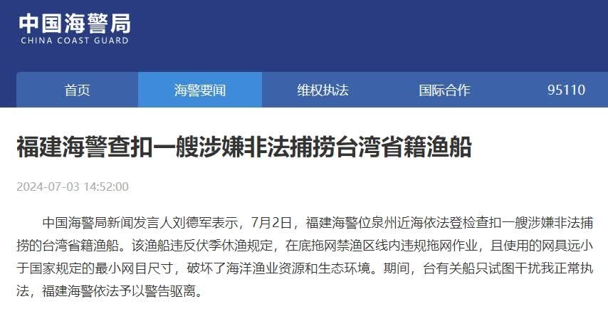 中國海警局網頁截圖 海警局新聞發言人劉德軍指出,該漁船違反伏季休漁規定,在底拖網禁漁區線內違規拖網作業,且使用的網具遠小於國家規定的最小網目尺寸,破壞了海洋漁業資源和生態環境。 期間,台灣方面有船隻試圖干擾大陸方面正常執法,劉德軍表示,福建海警依法予以警告驅離。 台灣行政機構3日表示,被大陸方面查扣的台灣漁船共有2名台灣籍、3名印度尼西亞籍人員,此案是漁船闖入休漁期的陸方水域作業,再次提醒漁民提高警覺,不要違反陸方伏季休漁規定。 台行政機構發言人陳世凱稱,呼籲陸方體恤“漁民為求生計涉險捕魚的辛勞”,期望陸方儘快“釋放人船,確保人員平安”。(完) 【編輯:李冉】