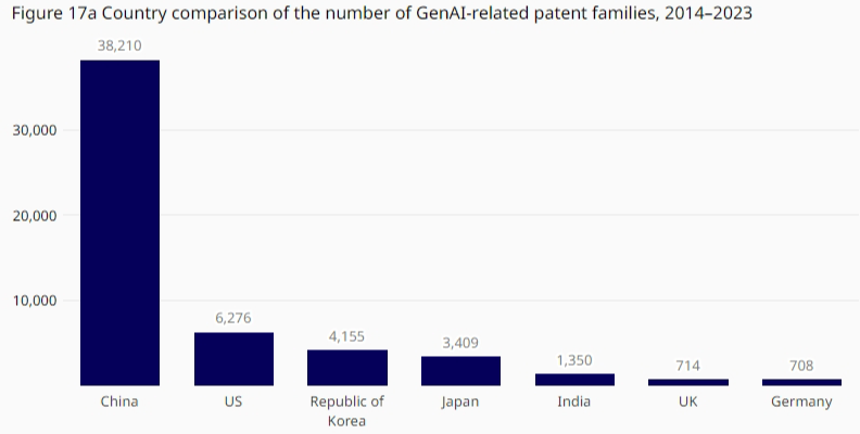 聯合國報告:中國生成式AI專利申請量是美國六倍香港新聞網7月4日電 7月3日,聯合國世界知識產權組織(WIPO)發佈最新報告顯示,中國在聊天機器人等生成式人工智能(AI)發明方面遠遠領先於全球其他國家,申請的專利數量足足是美國的六倍。 觀察者網報道,根據該組織發佈的《生成式AI專利態勢報告》統計數據,在2014至2023年的十年間,生成式AI的專利申請數量在全球範圍內激增,超過5萬份,其中超四分之一專利申請於2023年提交。 據介紹,生成式AI是一種從現有信息中生成文本、圖像、計算機代碼甚至音樂的技術,目前已在生命科學、製造業、交通運輸、安全和電信等行業中應用普及。 世界知識產權組織表示,過去十年間,中國提交了超3.8萬份生成式AI專利申請,是同期美國提交申請數量(6276份)的約六倍。韓國、日本和印度則分別排名第三、第四和第五。
