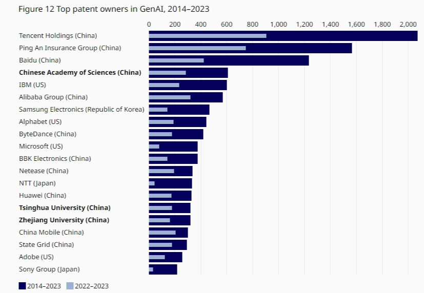 數據顯示,中國在生成式AI專利申請數量上遙遙領先。(圖源:WIPO) 具體來看,生成式AI專利申請量排名前10的企業和機構為:騰訊(2074份)、平安保險(1564份)、百度(1234份)、中國科學院(607份)、IBM(601份,美國)、阿里巴巴集團(571份)、三星電子(468份,韓國)、Alphabet(443份,美國)、字節跳動(418份)、微軟(377份、美國)。 其中,中國企業和機構前十佔六、前五佔四,美國前十佔三。