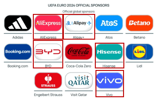 當地時間6月15日,在西班牙队與克罗地亚队的比賽中,可以看到賽場邊中國品牌的廣告。(來源:新華社) 2024歐洲杯自6月中旬起在德國舉行,除了精彩紛呈的比賽,吸引觀眾眼球的還有比賽場邊頻繁滾動播出的中國品牌廣告。 在本屆歐洲杯13家官方頂級贊助商中,中國佔了5席,分別是電視品牌海信(Hisense)、阿里巴巴旗下的支付寶(AliPay)及跨境電商平台速賣通(AliExpress)、手機品牌Vivo和電動車巨頭比亞迪(BYD)。 這五個品牌佔據了歐洲杯官方贊助商超三分之一的席位,刷新中國企業贊助歐洲杯數量最多記錄,也是中國連續第二次成為歐洲杯贊助商最多的國家。 對此,德國媒體7月1日報道稱,中國廠商的廣告明確顯示了“誰才是財神爺”。