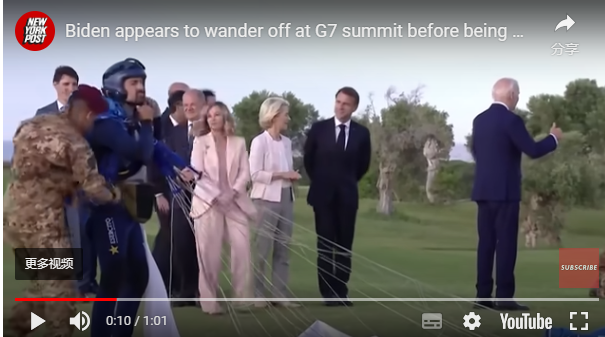 畢竟這是一場90分鐘的言辭交鋒。拜登的聲音虛弱得就像耳語,講話時語速很慢,即便是這樣也經常講錯,不停更正。 談到醫保和稅改,拜登一度停頓數秒,一些回答也令人費解。例如,當疑似想表達擊退新冠疫情時,誤稱“擊退醫療保險”。在特朗普一次又一次的言語攻擊時,他常常張開嘴巴,茫然凝視對方。在移民問題上,他本應強調移民增加有利於美國經濟與壓抑通膨,卻不知為何提到美國女性遭移民殺害事件,正中特朗普下懷。最後,拜登在妻子攙扶下走下辯論台。 外媒形容,拜登在辯論中的表現是一場災難級的失敗。外界嚴重懷疑拜登能否勝任下一個4年任期,有專欄文章寫道:“拜登能送給美國的最好的禮物:退選”。 實際上,此前的多場活動,拜登就顯得有些“呆”。在意大利G7峰會上,一眾領袖在草坪上觀看軍人跳傘表演,拜登在片段離群往反方向緩慢走去,意大利總理見狀把他拉回來。又如在洛杉磯的一場籌款活動中,網上流傳影片顯示,結束時拜登站在台上一動不動,同台的奧巴馬出手拉他的手腕才把他帶走。