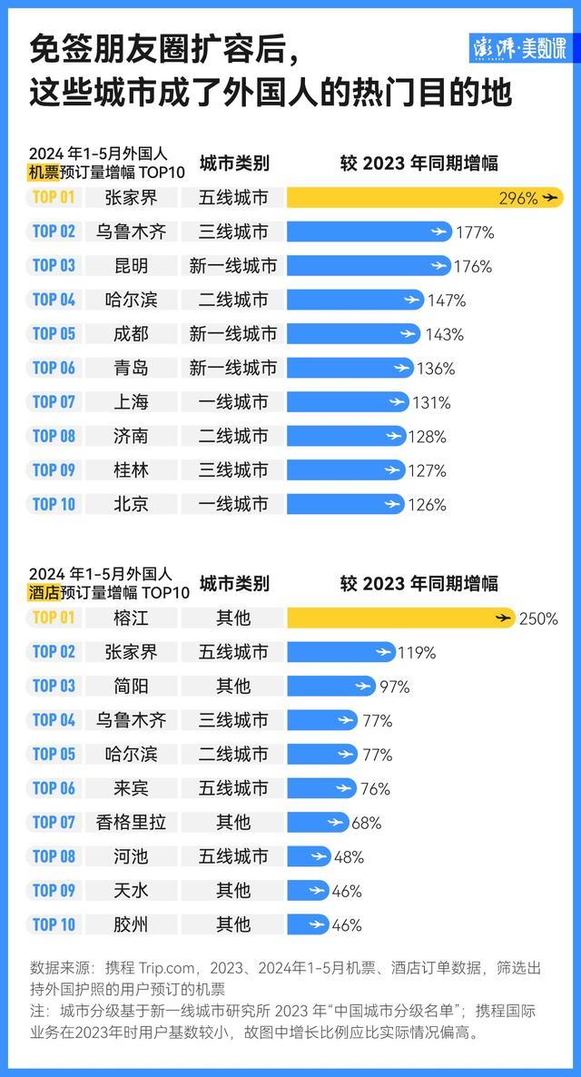 “China Travel”爆火 | 中國這麼大,外國人最愛去哪裡玩?香港新聞網7月7日電 在上海的南京西路,每走上五步就能碰到一個外國人。入境游之火熱,可見一斑。據國家移民管理局發佈的最新數據,2024年上半年,全國各口岸入境外國人1463.5萬人次,同比增長152.7%。其中通過免簽入境854.2萬人次,占比52%,同比增長190.1%。 澎湃新聞報道,去年以來,中國對多個國家如澳大利亞、法國、德國等國試行單方面免簽,還與新加坡、馬來西亞和泰國等國互免簽證。中國還在全國18個省份的38個對外開放口岸,對美國、英國、加拿大、韓國、日本等54個國家人員實施了72小時或144小時過境免簽政策,游客憑藉聯程客票從中國過境前往第三國前,可以提出過境免簽申請。 免簽擴容後,這些城市成外國人熱門目的地 據攜程數據,2024 年上半年入境外國游客酒店預訂量前十的城市分別是上海、北京、廣州、深圳、成都、杭州、重慶、昆明、西安和南京,都是國內熱門的旅游目的地。 將機票和酒店預訂數據與2023年同期比較的時候,一些更小眾的城市就浮現出來了。