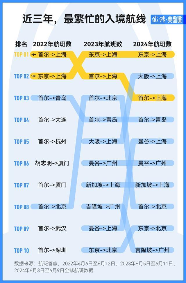 2024 年,從境外飛來中國最忙碌的航線是東京到上海。從 2022 到 2024 年,可以看到它的復甦過程,從一周僅有 14 班飛機,恢複到一周 93 班,再到 2024 年 6 月的一周 186 班,這意味著平均每隔一小時,便有一架飛機從東京起飛,出發去上海。 而這可能也并沒有恢複到 2019 年的水平。據航班管家數據,2024 年6月首周日本飛中國的航班數,僅有 2019年同期的77%。