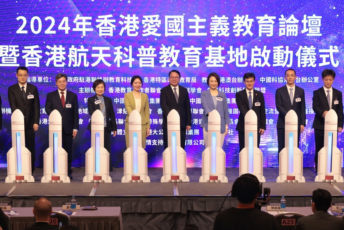 7月6日,2024年香港愛國主義教育論壇在香港會議展覽中心舉行,政務司司長陳國基(中)、中聯辦副主任盧新寧(左四)、全國人大常委會委員李慧琼(右四)等嘉賓出席。論壇今年踏入第四年,以“弘揚科學家精神 陶鑄新時代棟樑”為主題,攜手社會各界,弘揚科學家精神。(香港中通社記者 謝光磊 攝)