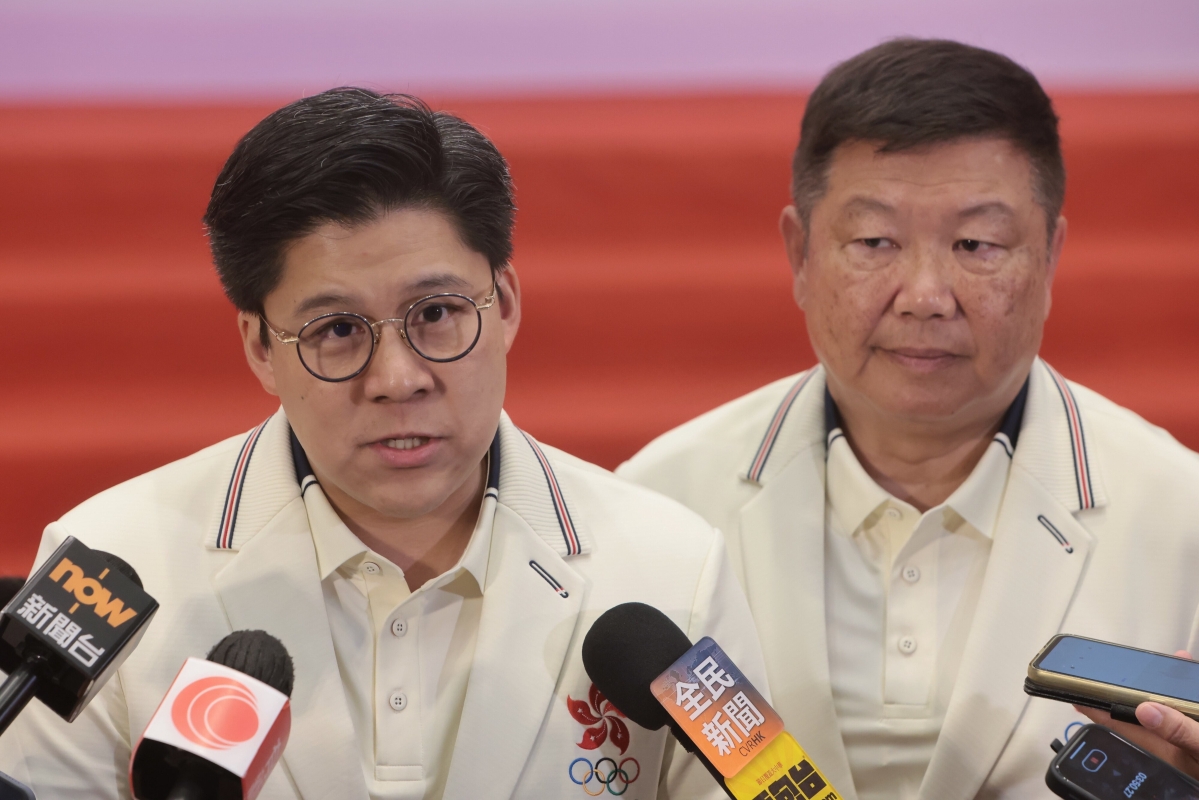 港協暨奧委會副會長霍啟剛(左)、港協暨奧運會義務秘書長楊祖賜(右)出席活動後會見傳媒